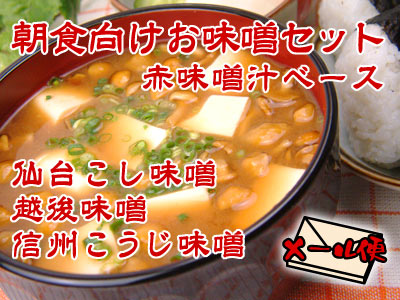 朝はすっきり!辛めの赤味噌!赤味噌汁ベース・朝食向けお味噌セット 価格: 1,050円 レビュー評価: 0.0 レビュー数:0 老舗味噌屋のミニ知恵袋付きレシピ同封 赤味噌汁ベース・朝食向けお味噌セット 朝食に食べていただきたい、お味噌汁レシピもサービスします。しかも、老舗味噌屋のミニ知恵袋付きレシピです。嬉しい1,000円ポッキリ!メール便なら、なんと送料210円でお届けいたします。 栄養も美味しさもタップリのお味噌汁をしっかり食べて、朝のスタートをしっかり切りましょう! ●商品名 赤味噌汁ベース・朝食向けお味噌セット ●商品内容仙台こし味噌×160g 越後味噌×160g 信州こうじ味噌×120g ●原材料大豆(遺伝子組み換えを含まず)・米・塩・酒精●原産地 宮城県、新潟県、長野県 ●賞味期限約6ヶ月直射日光、高温多 Supported by 楽天ウェブサービス |